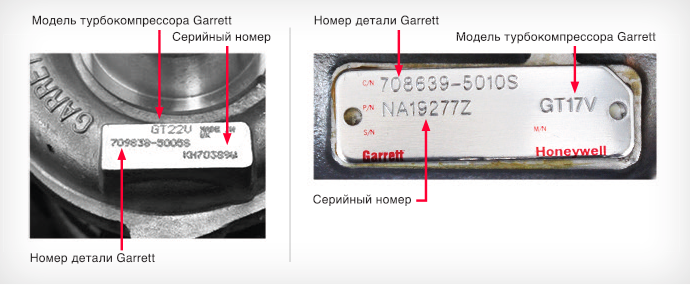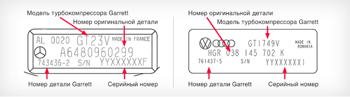 Паспортні таблички можуть відрізнятися; це залежить від того, чи стосується паспортна табличка до оригінального турбокомпресору, встановленому автовиробником, або до турбокомпресора, придбаному через незалежний ринок післяпродажного обслуговування. На табличці вказуються замовник або номер деталі Garrett, модель турбокомпресора і серійний номер – вся ця інформація наведена для того, щоб допомогти вам замовити турбокомпресор.